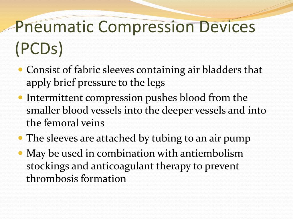 Pneumatic Compression Devices (PCDs) • Consist of fabric sleeves containing air bladders that apply brief pressure to the legs • Intermittent compression pushes blood from the smaller blood vessels into the deeper vessels and into the femoral veins • The sleeves are attached by tubing to an air pump • May be used in combination with antiembolism stockings and anticoagulant therapy to prevent thrombosis formation