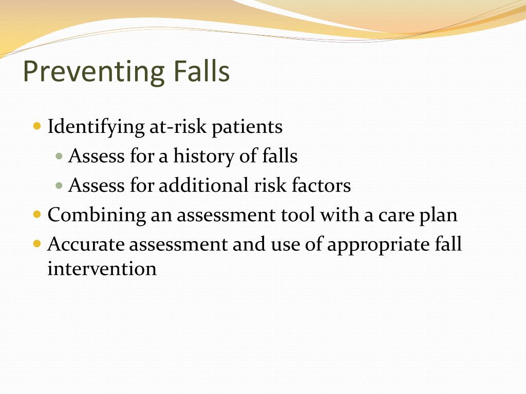 Preventing Falls • Identifying at-risk patients • Assess for a history of falls • Assess for additional risk factors • Combining an assessment tool with a care plan • Accurate assessment and use of appropriate fall intervention