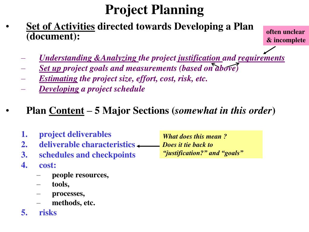 Project Planning often unclear & incomplete • Set of Activities directed towards Developing a Plan (document): • Understanding &Analyzing the project justification and requirements • Set up project goals and measurements (based on above) • Estimating the project size, effort, cost, risk, etc. • Developing a project schedule • Plan Content – 5 Major Sections (somewhat in this order) • project deliverables • deliverable characteristics • schedules and checkpoints • cost: • people resources, • tools, • processes, • methods, etc. • risks What does this mean ? Does it tie back to “justification?” and “goals”