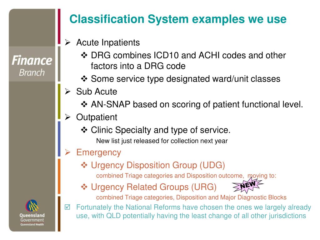 Classification System examples we use • Acute Inpatients • DRG combines ICD10 and ACHI codes and other factors into a DRG code • Some service type designated ward/unit classes • Sub Acute • AN-SNAP based on scoring of patient functional level. • Outpatient • Clinic Specialty and type of service. • New list just released for collection next year • Emergency • Urgency Disposition Group (UDG) • combined Triage categories and Disposition outcome, moving to: • Urgency Related Groups (URG) • combined Triage categories, Disposition and Major Diagnostic Blocks • Fortunately the National Reforms have chosen the ones we largely already use, with QLD potentially having the least change of all other jurisdictions NEW