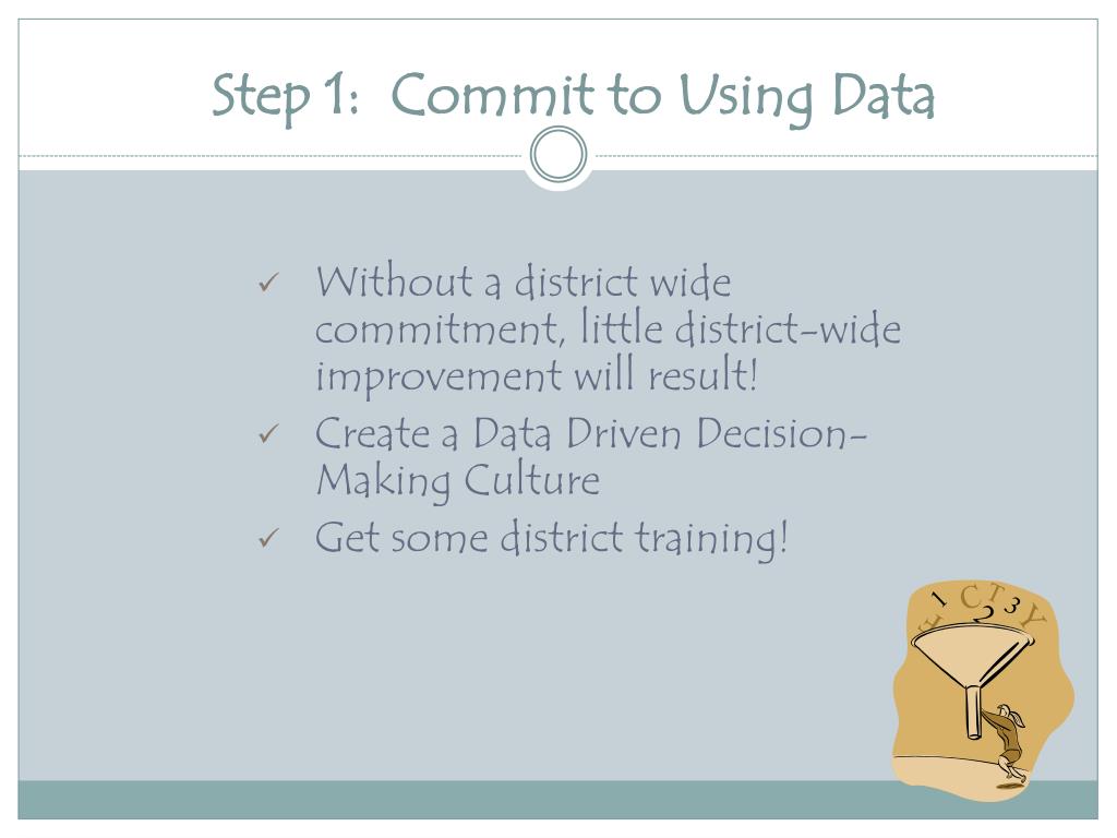 Step 1: Commit to Using Data • Without a district wide commitment, little district-wide improvement will result! • Create a Data Driven Decision-Making Culture • Get some district training!