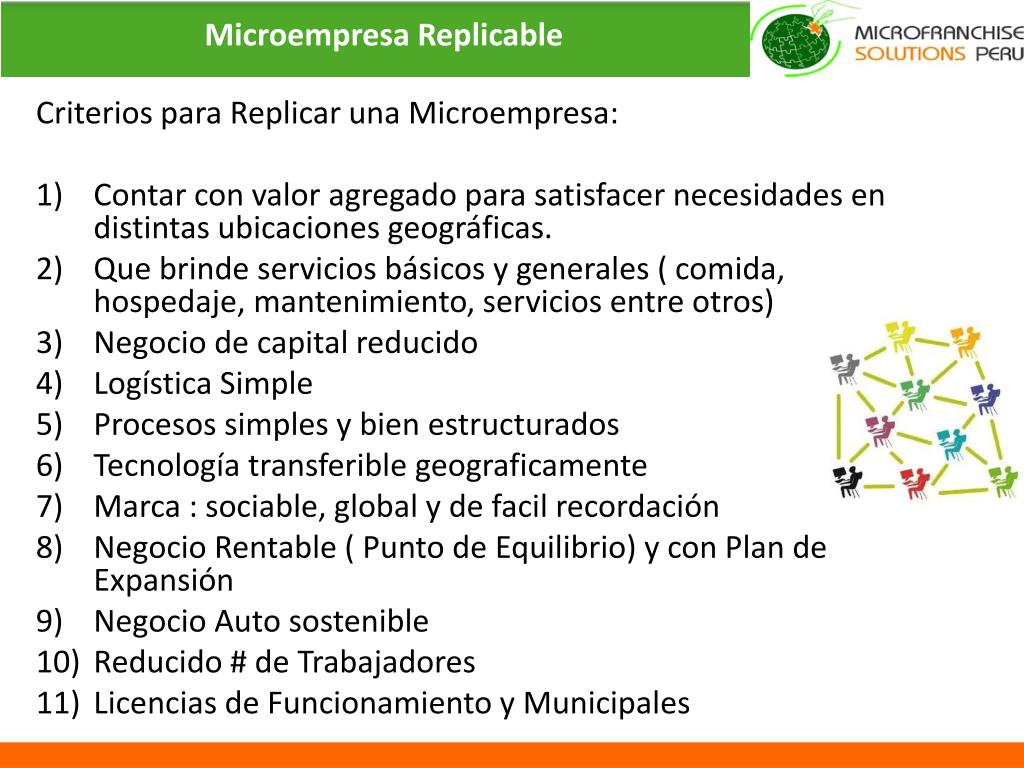 Microempresa Replicable Criterios para Replicar una Microempresa: Contar con valor agregado para satisfacer necesidades en distintas ubicaciones geográficas. Que brinde servicios básicos y generales ( comida, hospedaje, mantenimiento, servicios entre otros) Negocio de capital reducido Logística Simple Procesos simples y bien estructurados Tecnología transferible geograficamente Marca : sociable, global y de facil recordación Negocio Rentable ( Punto de Equilibrio) y con Plan de Expansión Negocio Auto sostenible Reducido # de Trabajadores Licencias de Funcionamiento y Municipales