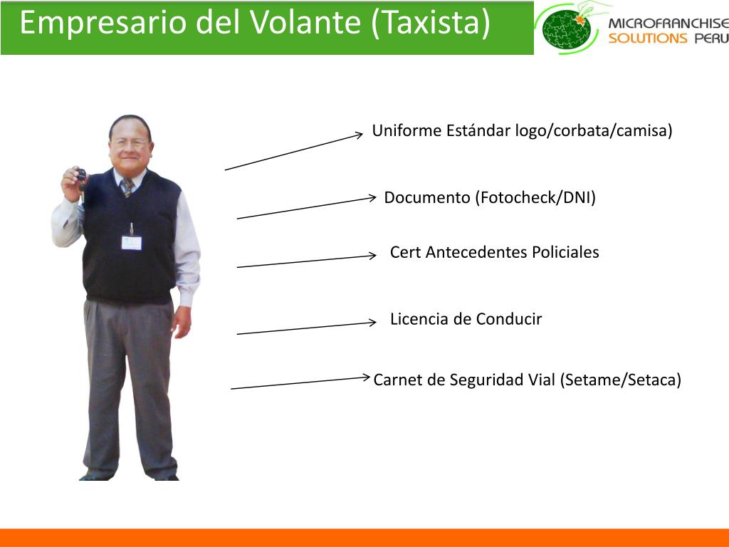 Empresario del Volante (Taxista) Uniforme Estándar logo/corbata/camisa) Documento (Fotocheck/DNI) Cert Antecedentes Policiales Licencia de Conducir Carnet de Seguridad Vial (Setame/Setaca)