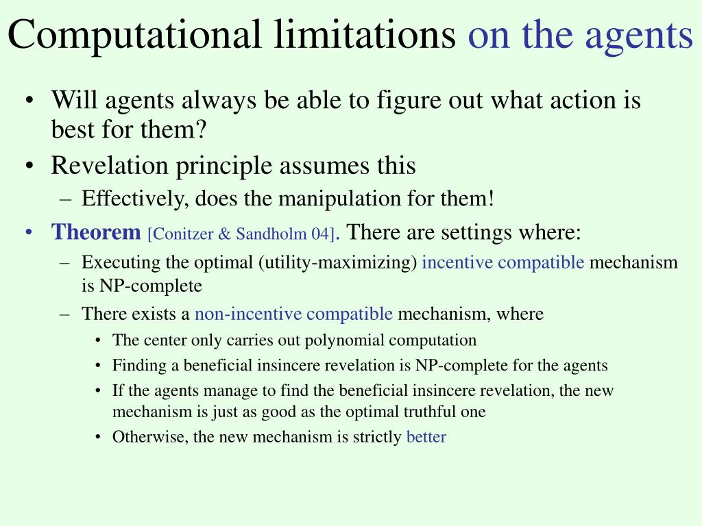 Computational limitations on the agents • Will agents always be able to figure out what action is best for them? • Revelation principle assumes this • Effectively, does the manipulation for them! • Theorem[Conitzer & Sandholm 04]. There are settings where: • Executing the optimal (utility-maximizing) incentive compatible mechanism is NP-complete • There exists a non-incentivecompatible mechanism, where • The center only carries out polynomial computation • Finding a beneficial insincere revelation is NP-complete for the agents • If the agents manage to find the beneficial insincere revelation, the new mechanism is just as good as the optimal truthful one • Otherwise, the new mechanism is strictly better