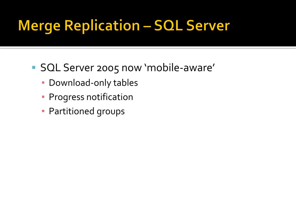 Merge Replication – SQL Server • SQL Server 2005 now ‘mobile-aware’ • Download-only tables • Progress notification • Partitioned groups