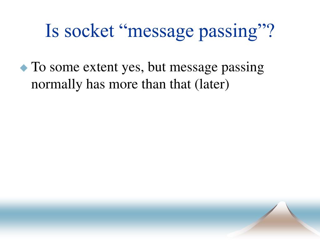 Is socket “message passing”? • To some extent yes, but message passing normally has more than that (later)