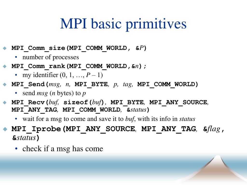 MPI basic primitives • MPI_Comm_size(MPI_COMM_WORLD, &P) • number of processes • MPI_Comm_rank(MPI_COMM_WORLD,&n); • my identifier (0, 1, …, P – 1) • MPI_Send(msg,n, MPI_BYTE,p,tag, MPI_COMM_WORLD) • send msg (n bytes) to p • MPI_Recv(buf, sizeof(buf), MPI_BYTE, MPI_ANY_SOURCE, MPI_ANY_TAG, MPI_COMM_WORLD, &status) • wait for a msg to come and save it to buf, with its info in status • MPI_Iprobe(MPI_ANY_SOURCE, MPI_ANY_TAG, &flag, &status) • check if a msg has come