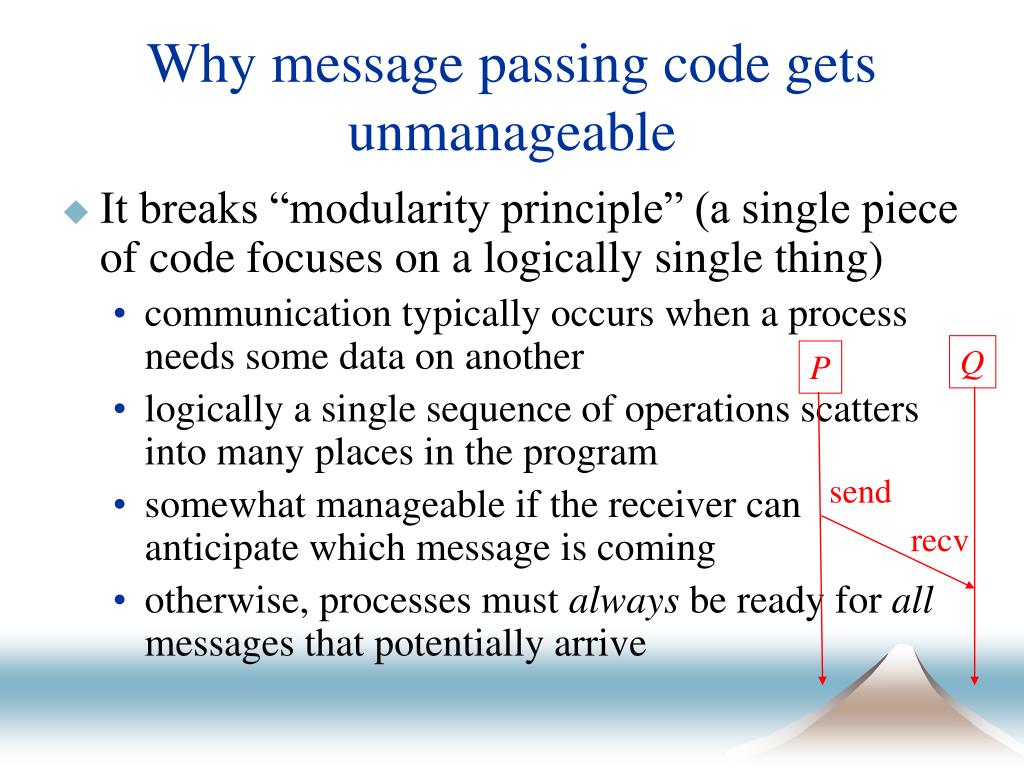 Why message passing code gets unmanageable • It breaks “modularity principle” (a single piece of code focuses on a logically single thing) • communication typically occurs when a process needs some data on another • logically a single sequence of operations scatters into many places in the program • somewhat manageable if the receiver can anticipate which message is coming • otherwise, processes must always be ready for all messages that potentially arrive Q P send recv