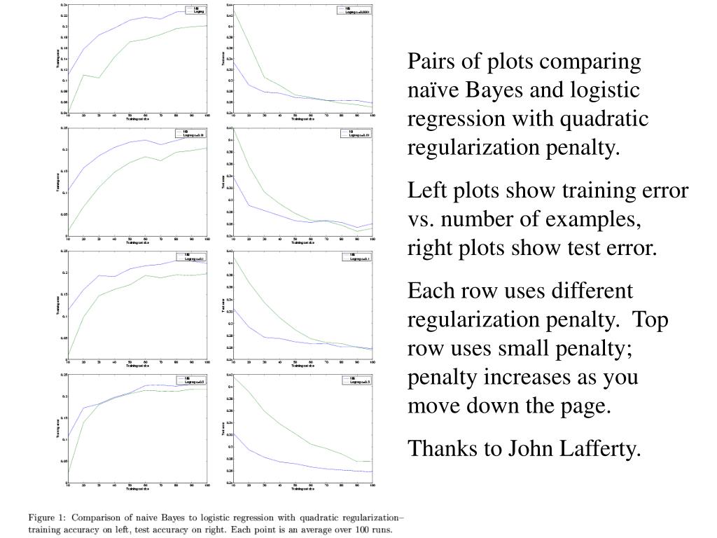 Pairs of plots comparing naïve Bayes and logistic regression with quadratic regularization penalty. Left plots show training error vs. number of examples, right plots show test error. Each row uses different regularization penalty. Top row uses small penalty; penalty increases as you move down the page. Thanks to John Lafferty.