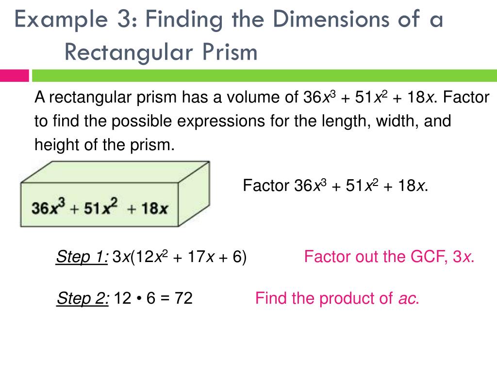 Example 3: Finding the Dimensions of a Rectangular Prism A rectangular prism has a volume of 36x3 + 51x2 + 18x. Factor to find the possible expressions for the length, width, and height of the prism. Factor 36x3 + 51x2 + 18x. Step 1: 3x(12x2 + 17x + 6) Factor out the GCF, 3x. Step 2: 12 • 6 = 72 Find the product of ac.