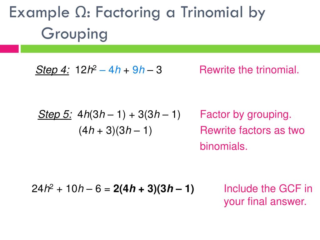 Find two factors of ac that have a sum b. Use mental math to determine a good place to start. Step 3:Factors Sum –2(18) = –36 –2 + 18 = 16 –3(12) = –36 –3 + 12 = 9 –4(9) = –36 –4 + 9 = 5 Example Ω: Factoring a Trinomial by Grouping Factor 24h2 + 10h – 6. Step 1:24h2 + 10h – 6 = 2(12h2 + 5h – 3) Factor out the GCF, 2. Step 2: 12 • –3 = –36 Find the product of ac.
