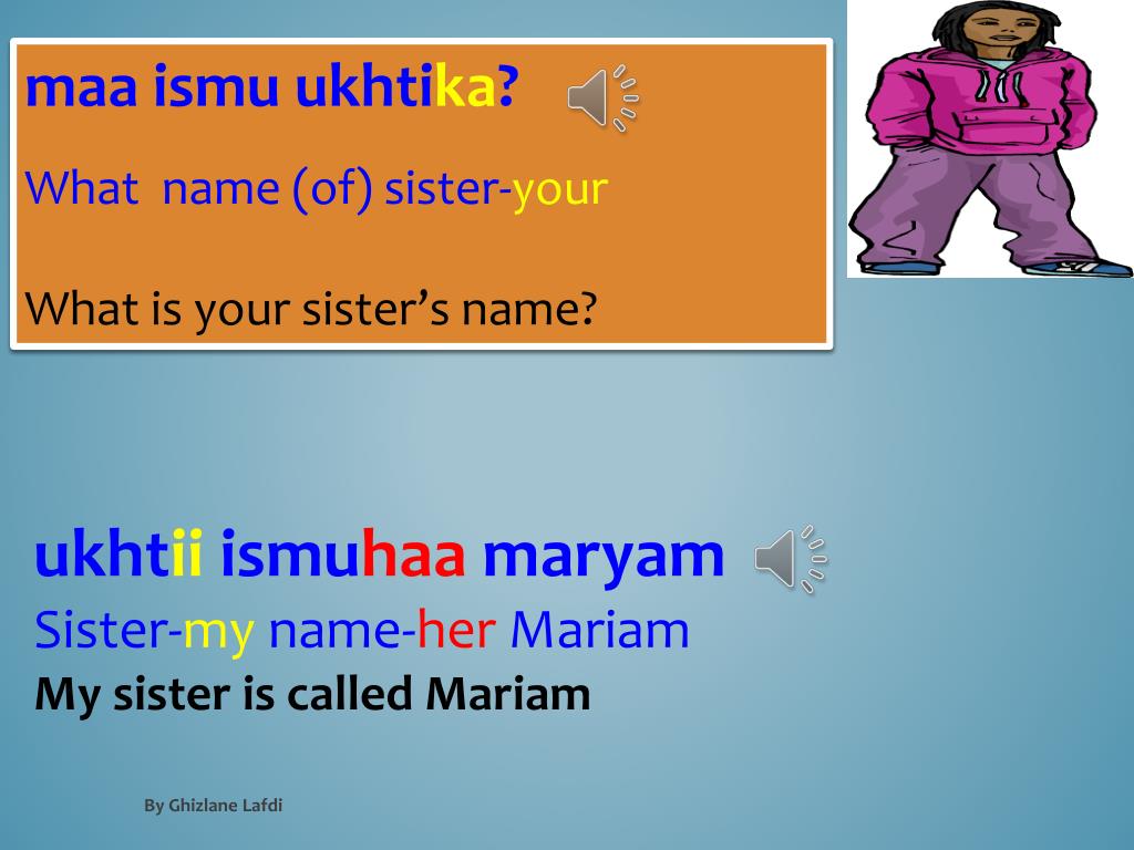 maaismuukhtika? What name (of) sister-your What is your sister’s name? ukhtiiismuhaamaryam Sister-my name-her Mariam My sister is called Mariam By Ghizlane Lafdi