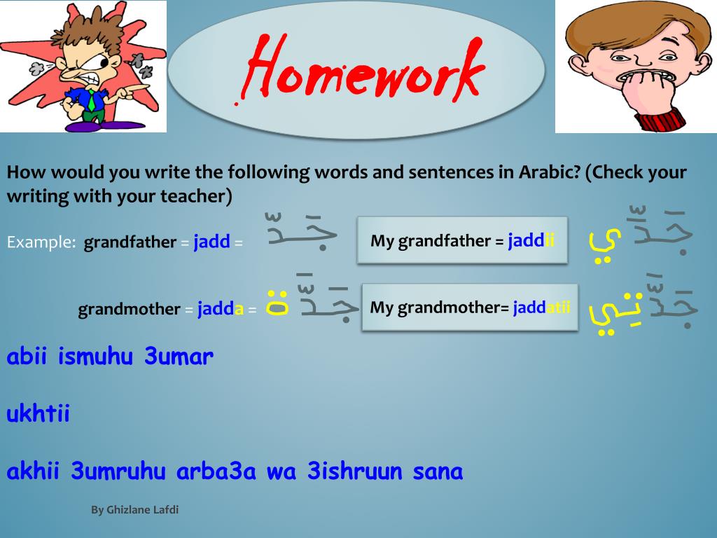Homework How would you write the following words and sentences in Arabic? (Check your writing with your teacher) Example: grandfather = jadd= grandmother = jadda= abiiismuhu 3umar ukhtii akhii 3umruhu arba3a wa 3ishruun sana My grandfather = jaddii My grandmother= jaddatii By GhizlaneLafdi