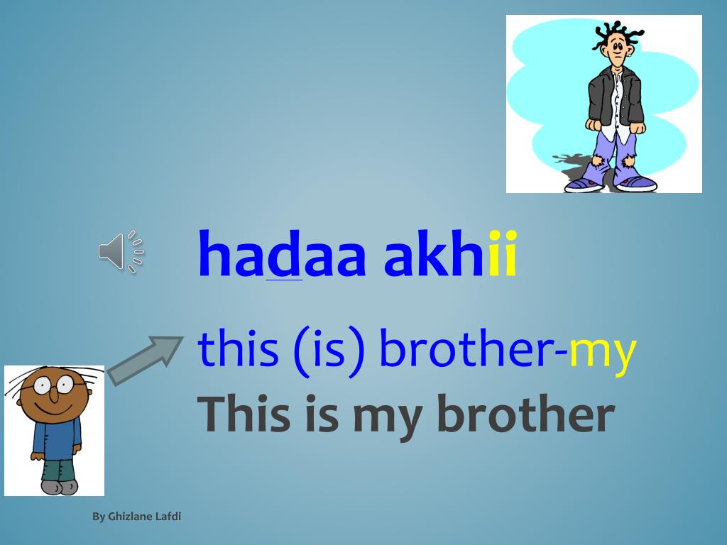 maaismuakhiika? What name (of) brother-your What is your brother’s name? akhiiismuhusamiir Brother-my name-his Sameer My brother is called samiir By GhizlaneLafdi