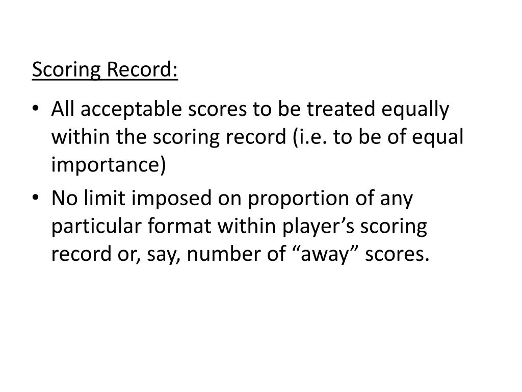 Scoring Record: • All acceptable scores to be treated equally within the scoring record (i.e. to be of equal importance) • No limit imposed on proportion of any particular format within player’s scoring record or, say, number of “away” scores.