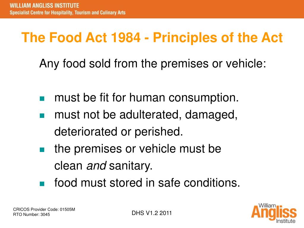 The Food Act 1984 - Principles of the Act Any food sold from the premises or vehicle: • must be fit for human consumption. • must not be adulterated, damaged, deteriorated or perished. • the premises or vehicle must be clean and sanitary. • food must stored in safe conditions. DHS V1.2 2011