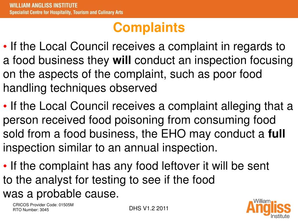 Complaints • If the Local Council receives a complaint in regards to a food business they will conduct an inspection focusing on the aspects of the complaint, such as poor food handling techniques observed • If the Local Council receives a complaint alleging that a • person received food poisoning from consuming food • sold from a food business, the EHO may conduct a full • inspection similar to an annual inspection. • If the complaint has any food leftover it will be sent • to the analyst for testing to see if the food • was a probable cause. DHS V1.2 2011