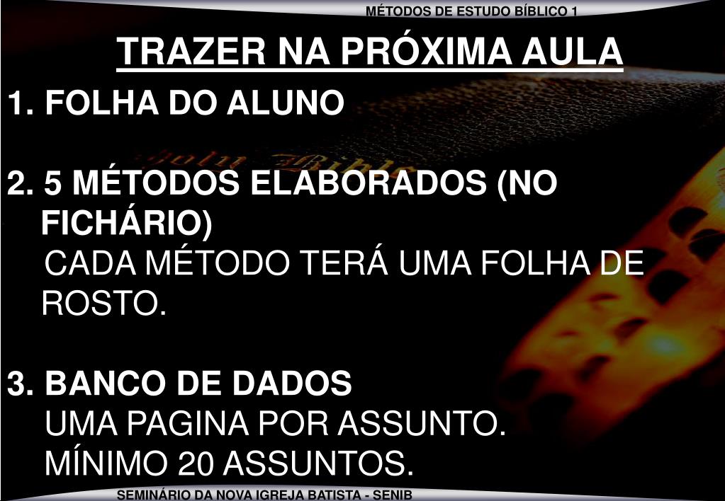MÉTODOS DE ESTUDO BÍBLICO. TRAZER NA PRÓXIMA AULA. FOLHA DO ALUNO 2. 5 MÉTODOS ELABORADOS (NO FICHÁRIO) CADA MÉTODO TERÁ UMA FOLHA DE ROSTO. 3. BANCO DE DADOS UMA PAGINA POR ASSUNTO. MÍNIMO 20 ASSUNTOS. TIAGO 1:21-25.