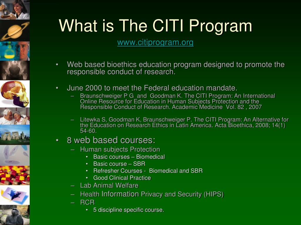 What is The CITI Program www.citiprogram.org • Web based bioethics education program designed to promote the responsible conduct of research. • June 2000 to meet the Federal education mandate. • Braunschweiger P G and Goodman K. The CITI Program: An International Online Resource for Education in Human Subjects Protection and the Responsible Conduct of Research. Academic Medicine Vol. 82 , 2007 • Litewka S, Goodman K, Braunschweiger P. The CITI Program: An Alternative for the Education on Research Ethics in Latin America. ActaBioethica, 2008; 14(1) 54-60. • 8 web based courses: • Human subjects Protection • Basic courses – Biomedical • Basic course – SBR • Refresher Courses - Biomedical and SBR • Good Clinical Practice • Lab Animal Welfare • Health Information Privacy and Security (HIPS) • RCR • 5 discipline specific course.