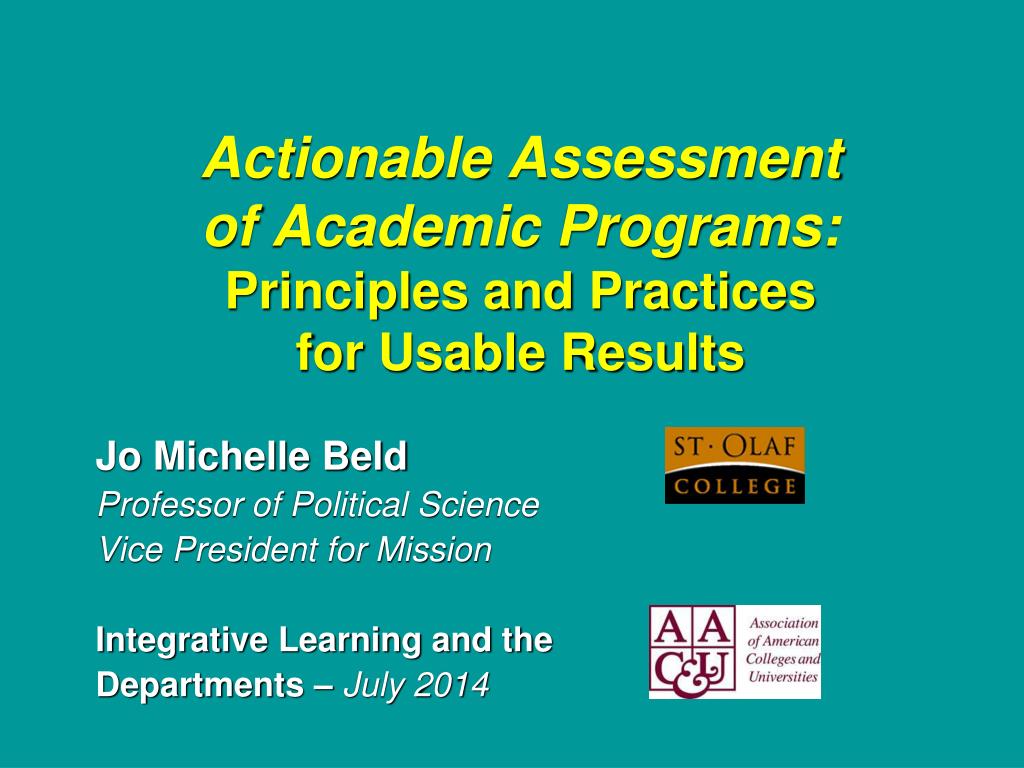 Actionable Assessmentof Academic Programs:Principles and Practicesfor Usable Results Jo Michelle Beld Professor of Political Science Vice President for Mission Integrative Learning and the Departments – July 2014