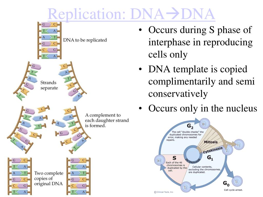 Replication: DNADNA • Occurs during S phase of interphase in reproducing cells only • DNA template is copied complimentarily and semi conservatively • Occurs only in the nucleus