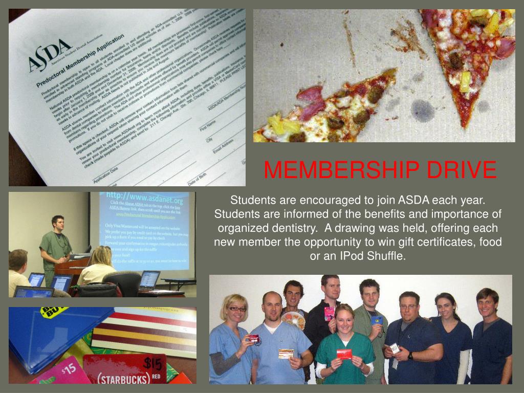 MEMBERSHIP DRIVE Students are encouraged to join ASDA each year. Students are informed of the benefits and importance of organized dentistry. A drawing was held, offering each new member the opportunity to win gift certificates, food or an IPod Shuffle.