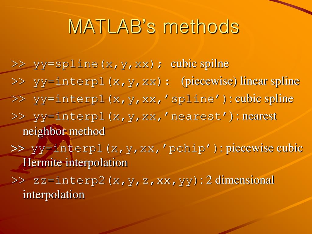MATLAB’s methods >> yy=spline(x,y,xx); cubic spilne >> yy=interp1(x,y,xx): (piecewise) linear spline >> yy=interp1(x,y,xx,’spline’): cubic spline >> yy=interp1(x,y,xx,’nearest’) : nearest neighbormethod >> yy=interp1(x,y,xx,’pchip’): piecewise cubic Hermite interpolation >> zz=interp2(x,y,z,xx,yy): 2 dimensional interpolation