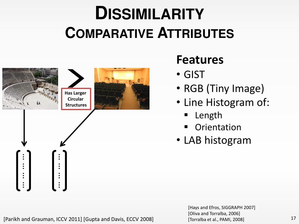 Dissimilarity Comparative Attributes Classifier Boosted Decision Tree [Hoiem et al., IJCV 2007] Has Larger Circular Structures ✗ ………… ………… or Has Larger Circular Structures [Parikh and Grauman, ICCV 2011] [Gupta and Davis, ECCV 2008]