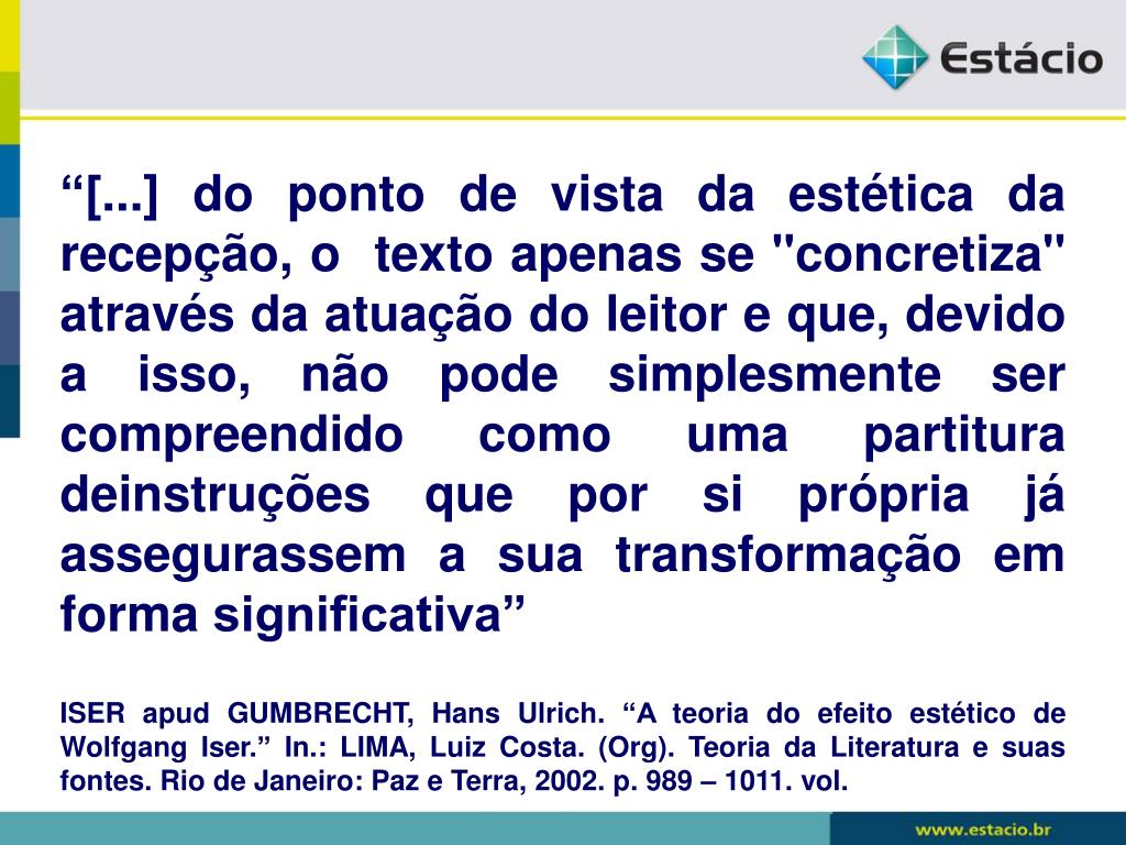 “[...] do ponto de vista da estética da recepção, o texto apenas se "concretiza" através da atuação do leitor e que, devido a isso, não pode simplesmente ser compreendido como uma partitura deinstruções que por si própria já assegurassem a sua transformação em forma significativa” ISER apud GUMBRECHT, Hans Ulrich. “A teoria do efeito estético de Wolfgang Iser.” In.: LIMA, Luiz Costa. (Org). Teoria da Literatura e suas fontes. Rio de Janeiro: Paz e Terra, 2002. p. 989 – 1011. vol.