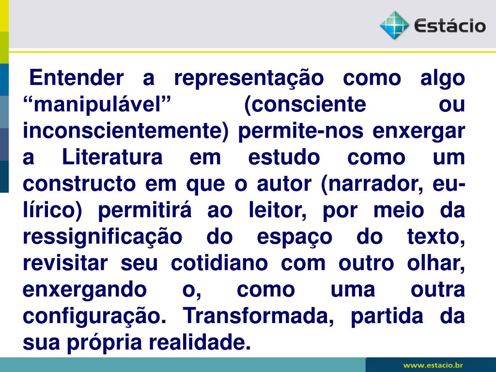 Entender a representação como algo “manipulável” (consciente ou inconscientemente) permite-nos enxergar a Literatura em estudo como um constructo em que o autor (narrador, eu-lírico) permitirá ao leitor, por meio da ressignificação do espaço do texto, revisitar seu cotidiano com outro olhar, enxergando o, como uma outra configuração. Transformada, partida da sua própria realidade.