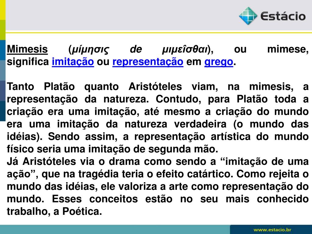 Mimesis (μίμησις de μιμεîσθαι), ou mimese, significa imitação ou representação em grego. Tanto Platão quanto Aristóteles viam, na mimesis, a representação da natureza. Contudo, para Platão toda a criação era uma imitação, até mesmo a criação do mundo era uma imitação da natureza verdadeira (o mundo das idéias). Sendo assim, a representação artística do mundo físico seria uma imitação de segunda mão. Já Aristóteles via o drama como sendo a “imitação de uma ação”, que na tragédia teria o efeito catártico. Como rejeita o mundo das idéias, ele valoriza a arte como representação do mundo. Esses conceitos estão no seu mais conhecido trabalho, a Poética.