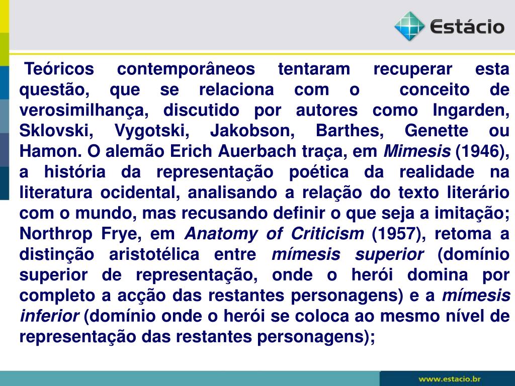 Teóricos contemporâneos tentaram recuperar esta questão, que se relaciona com o conceito de verosimilhança, discutido por autores como Ingarden, Sklovski, Vygotski, Jakobson, Barthes, Genette ou Hamon. O alemão Erich Auerbach traça, em Mimesis (1946), a história da representação poética da realidade na literatura ocidental, analisando a relação do texto literário com o mundo, mas recusando definir o que seja a imitação; Northrop Frye, em Anatomy of Criticism (1957), retoma a distinção aristotélica entre mímesis superior (domínio superior de representação, onde o herói domina por completo a acção das restantes personagens) e a mímesis inferior (domínio onde o herói se coloca ao mesmo nível de representação das restantes personagens);