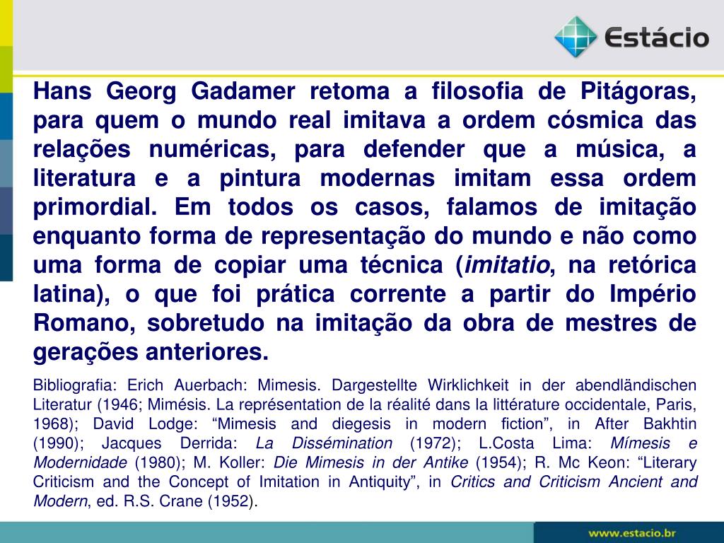 Hans Georg Gadamer retoma a filosofia de Pitágoras, para quem o mundo real imitava a ordem cósmica das relações numéricas, para defender que a música, a literatura e a pintura modernas imitam essa ordem primordial. Em todos os casos, falamos de imitação enquanto forma de representação do mundo e não como uma forma de copiar uma técnica (imitatio, na retórica latina), o que foi prática corrente a partir do Império Romano, sobretudo na imitação da obra de mestres de gerações anteriores. Bibliografia: Erich Auerbach: Mimesis. Dargestellte Wirklichkeit in der abendländischen Literatur (1946; Mimésis. La représentation de la réalité dans la littérature occidentale, Paris, 1968); David Lodge: “Mimesis and diegesis in modern fiction”, in After Bakhtin (1990); Jacques Derrida: La Dissémination (1972); L.Costa Lima: Mímesis e Modernidade (1980); M. Koller: Die Mimesis in der Antike (1954); R. Mc Keon: “Literary Criticism and the Concept of Imitation in Antiquity”, in Critics and Criticism Ancient and Modern, ed. R.S. Crane (1952).