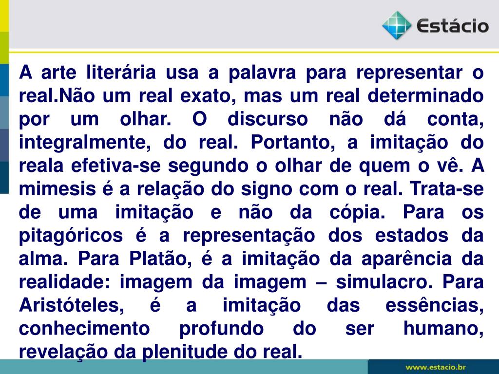 A arte literária usa a palavra para representar o real.Não um real exato, mas um real determinado por um olhar. O discurso não dá conta, integralmente, do real. Portanto, a imitação do reala efetiva-se segundo o olhar de quem o vê. A mimesis é a relação do signo com o real. Trata-se de uma imitação e não da cópia. Para os pitagóricos é a representação dos estados da alma. Para Platão, é a imitação da aparência da realidade: imagem da imagem – simulacro. Para Aristóteles, é a imitação das essências, conhecimento profundo do ser humano, revelação da plenitude do real.
