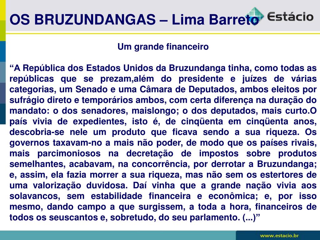 OS BRUZUNDANGAS – Lima Barreto Um grande financeiro “A República dos Estados Unidos da Bruzundanga tinha, como todas as repúblicas que se prezam,além do presidente e juízes de várias categorias, um Senado e uma Câmara de Deputados, ambos eleitos por sufrágio direto e temporários ambos, com certa diferença na duração do mandato: o dos senadores, maislongo; o dos deputados, mais curto.O país vivia de expedientes, isto é, de cinqüenta em cinqüenta anos, descobria-se nele um produto que ficava sendo a sua riqueza. Os governos taxavam-no a mais não poder, de modo que os países rivais, mais parcimoniosos na decretação de impostos sobre produtos semelhantes, acabavam, na concorrência, por derrotar a Bruzundanga; e, assim, ela fazia morrer a sua riqueza, mas não sem os estertores de uma valorização duvidosa. Daí vinha que a grande nação vivia aos solavancos, sem estabilidade financeira e econômica; e, por isso mesmo, dando campo a que surgissem, a toda a hora, financeiros de todos os seuscantos e, sobretudo, do seu parlamento. (...)”