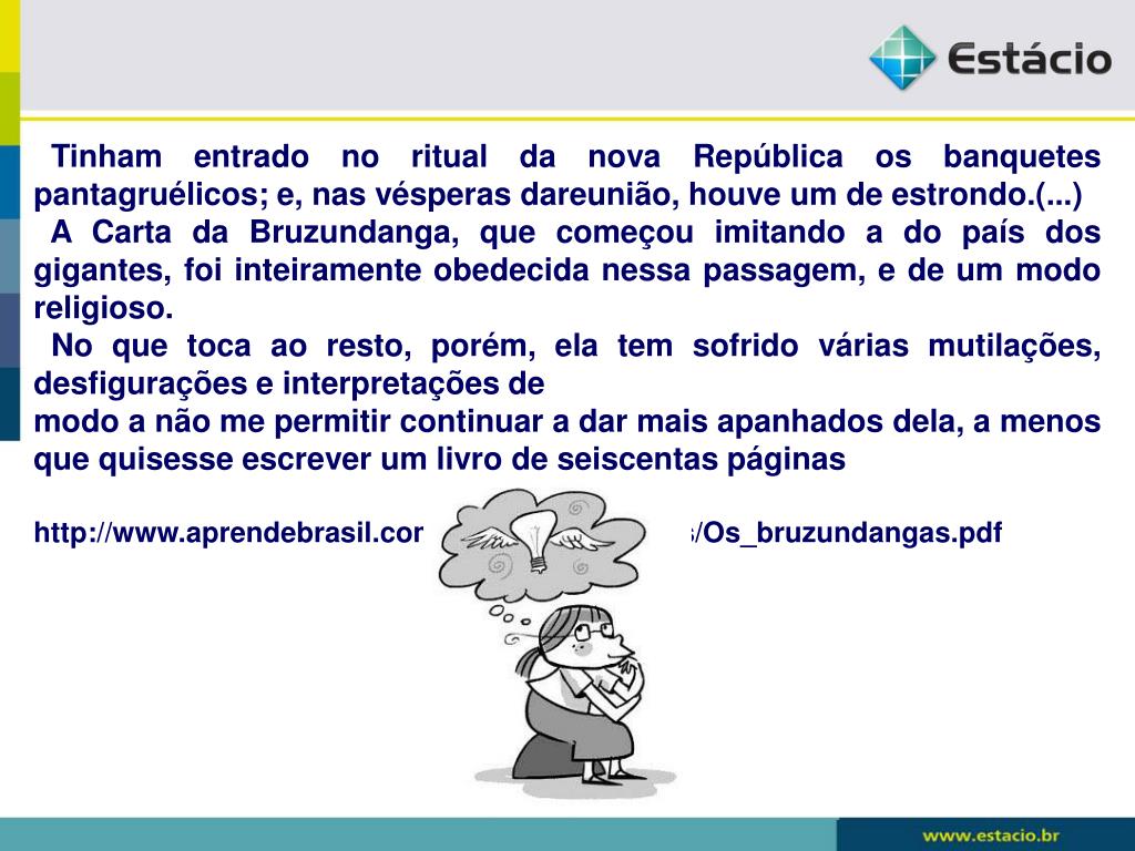 Tinham entrado no ritual da nova República os banquetes pantagruélicos; e, nas vésperas dareunião, houve um de estrondo.(...) A Carta da Bruzundanga, que começou imitando a do país dos gigantes, foi inteiramente obedecida nessa passagem, e de um modo religioso. No que toca ao resto, porém, ela tem sofrido várias mutilações, desfigurações e interpretações de modo a não me permitir continuar a dar mais apanhados dela, a menos que quisesse escrever um livro de seiscentas páginas http://www.aprendebrasil.com.br/classicos/obras/Os_bruzundangas.pdf