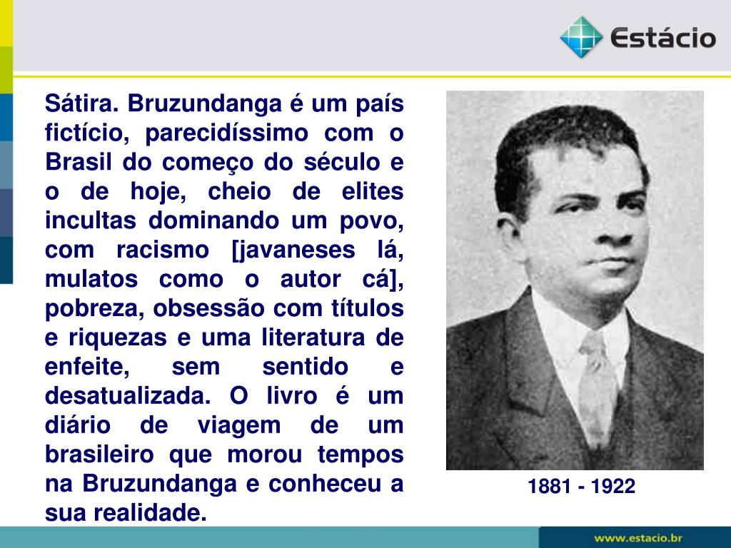 Sátira. Bruzundanga é um país fictício, parecidíssimo com o Brasil do começo do século e o de hoje, cheio de elites incultas dominando um povo, com racismo [javaneses lá, mulatos como o autor cá], pobreza, obsessão com títulos e riquezas e uma literatura de enfeite, sem sentido e desatualizada. O livro é um diário de viagem de um brasileiro que morou tempos na Bruzundanga e conheceu a sua realidade. 1881 - 1922