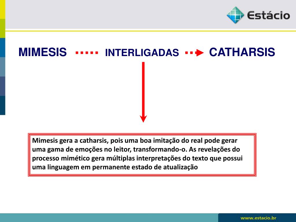 MIMESIS INTERLIGADAS CATHARSIS Mimesis gera a catharsis, pois uma boa imitação do real pode gerar uma gama de emoções no leitor, transformando-o. As revelações do processo mimético gera múltiplas interpretações do texto que possui uma linguagem em permanente estado de atualização