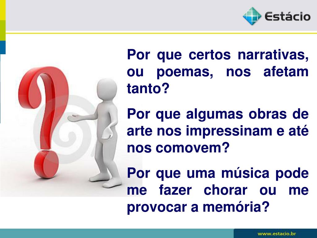 Por que certos narrativas, ou poemas, nos afetam tanto? Por que algumas obras de arte nos impressinam e até nos comovem? Por que uma música pode me fazer chorar ou me provocar a memória?
