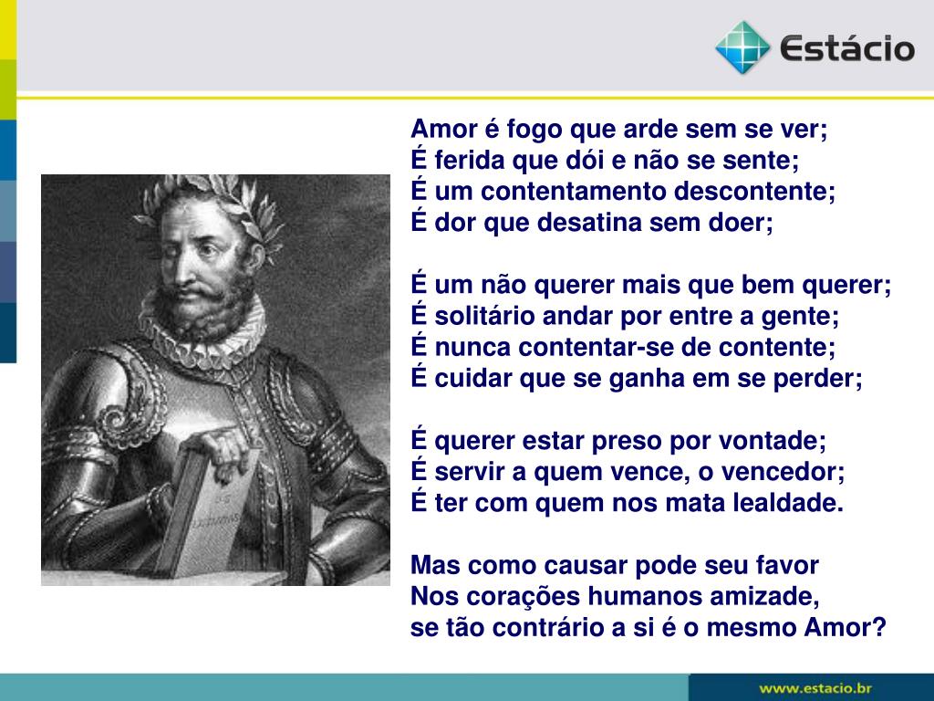 Amor é fogo que arde sem se ver;É ferida que dói e não se sente;É um contentamento descontente;É dor que desatina sem doer;É um não querer mais que bem querer;É solitário andar por entre a gente;É nunca contentar-se de contente;É cuidar que se ganha em se perder;É querer estar preso por vontade;É servir a quem vence, o vencedor;É ter com quem nos mata lealdade.Mas como causar pode seu favorNos corações humanos amizade,se tão contrário a si é o mesmo Amor?