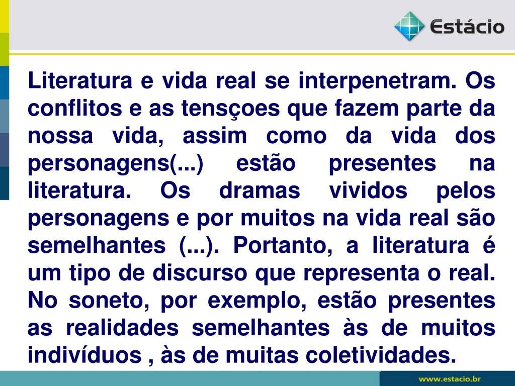 Literatura e vida real se interpenetram. Os conflitos e as tensçoes que fazem parte da nossa vida, assim como da vida dos personagens(...) estão presentes na literatura. Os dramas vividos pelos personagens e por muitos na vida real são semelhantes (...). Portanto, a literatura é um tipo de discurso que representa o real. No soneto, por exemplo, estão presentes as realidades semelhantes às de muitos indivíduos , às de muitas coletividades.