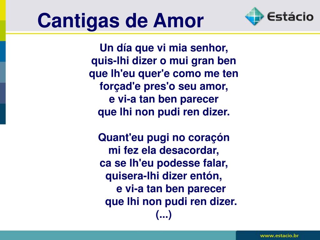 Cantigas de Amor Un día que vi mia senhor,quis-lhi dizer o mui gran benque lh'eu quer'e como me tenforçad'e pres'o seu amor,e vi-a tan ben parecerque lhi non pudi ren dizer.Quant'eu pugi no coraçónmi fez ela desacordar,ca se lh'eu podesse falar,quisera-lhi dizer entón, e vi-a tan ben parecer que lhi non pudi ren dizer.(...)