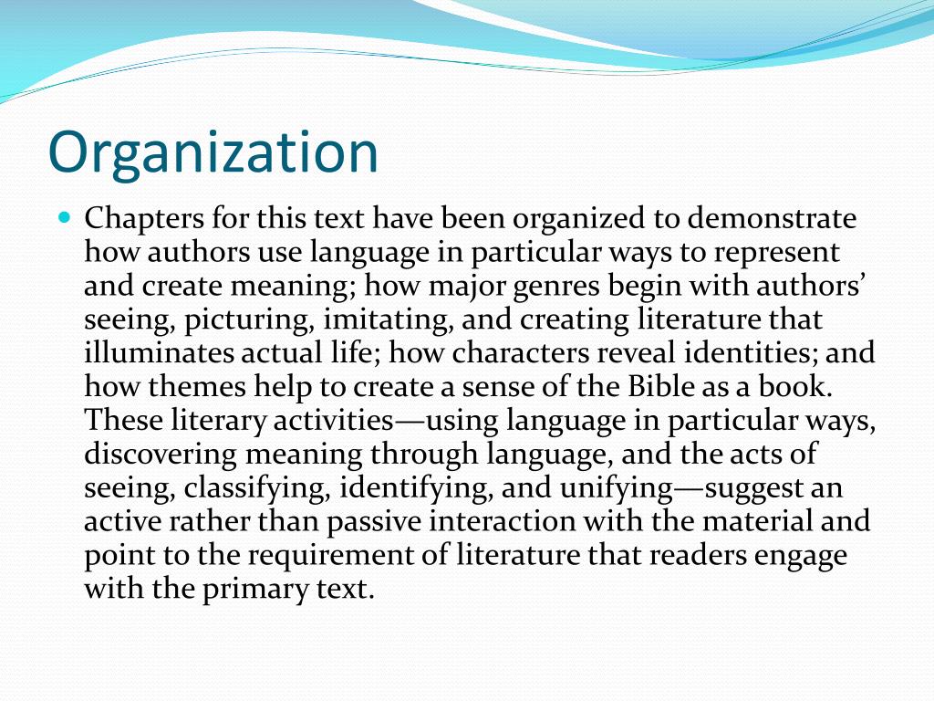 Organization • Chapters for this text have been organized to demonstrate how authors use language in particular ways to represent and create meaning; how major genres begin with authors’ seeing, picturing, imitating, and creating literature that illuminates actual life; how characters reveal identities; and how themes help to create a sense of the Bible as a book. These literary activities—using language in particular ways, discovering meaning through language, and the acts of seeing, classifying, identifying, and unifying—suggest an active rather than passive interaction with the material and point to the requirement of literature that readers engage with the primary text.
