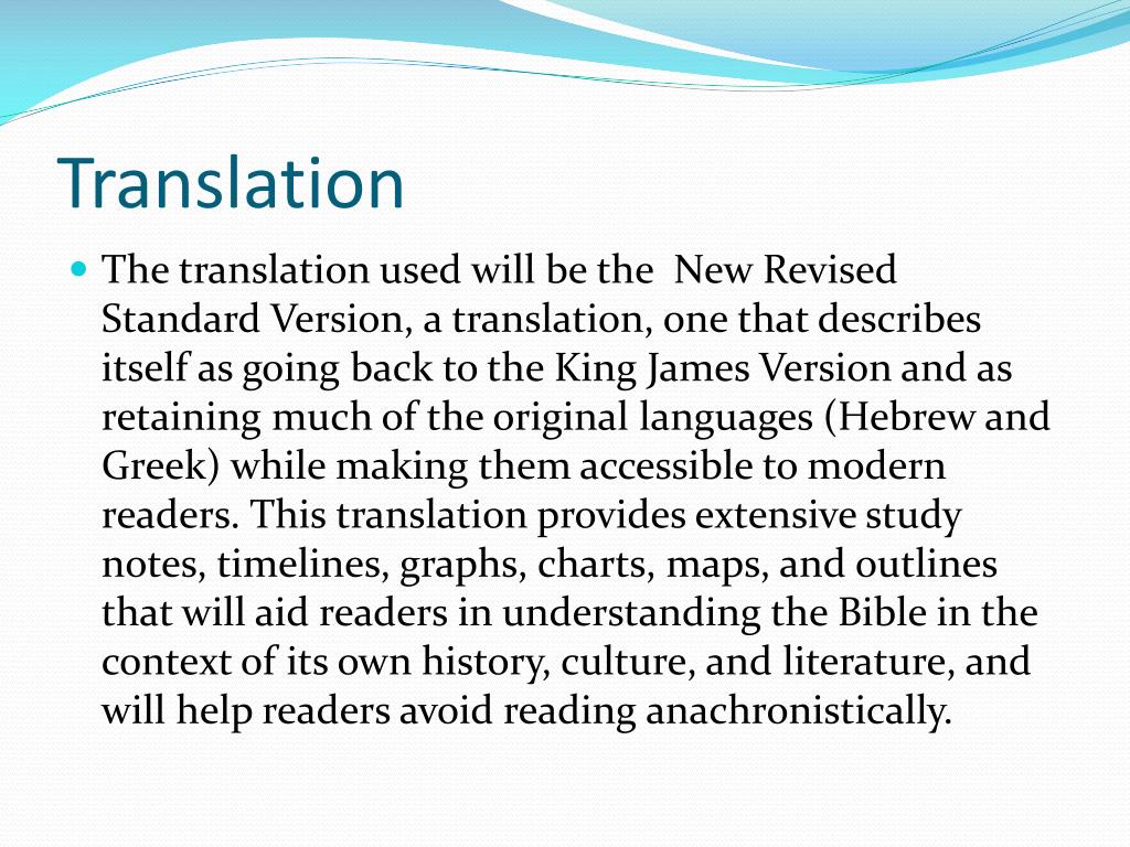 Translation • The translation used will be the New Revised Standard Version, a translation, one that describes itself as going back to the King James Version and as retaining much of the original languages (Hebrew and Greek) while making them accessible to modern readers. This translation provides extensive study notes, timelines, graphs, charts, maps, and outlines that will aid readers in understanding the Bible in the context of its own history, culture, and literature, and will help readers avoid reading anachronistically.