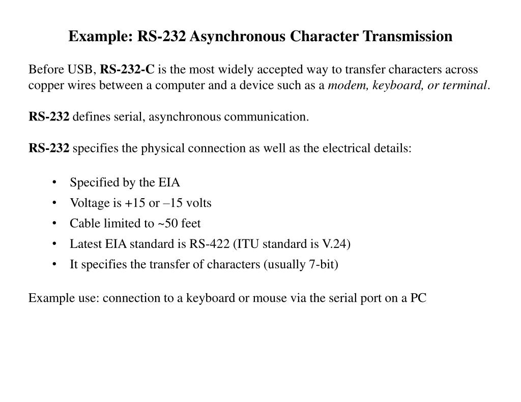 Example:RS-232 Asynchronous Character Transmission • Before USB, RS-232-C is the most widely accepted way to transfer characters across copper wires between a computer and a device such as a modem, keyboard, or terminal. • RS-232 defines serial, asynchronous communication. • RS-232 specifies the physical connection as well as the electrical details: • Specified by the EIA • Voltage is +15 or –15 volts • Cable limited to ~50 feet • Latest EIA standard is RS-422 (ITU standard is V.24) • It specifies the transfer of characters (usually 7-bit) • Example use: connection to a keyboard or mouse via the serial port on a PC