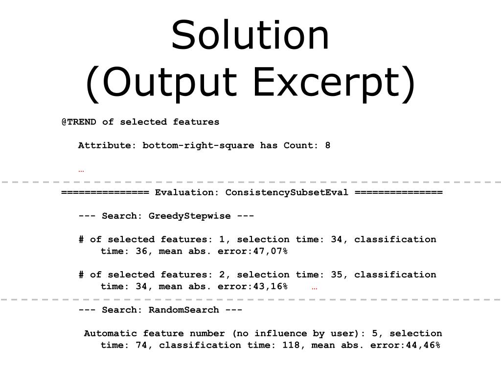 Solution (Output Excerpt) @TREND of selected features Attribute: bottom-right-square has Count: 8 … =============== Evaluation: ConsistencySubsetEval =============== --- Search: GreedyStepwise --- # of selected features: 1, selection time: 34, classification time: 36, mean abs. error:47,07% # of selected features: 2, selection time: 35, classification time: 34, mean abs. error:43,16% … --- Search: RandomSearch --- Automatic feature number (no influence by user): 5, selection time: 74, classification time: 118, mean abs. error:44,46%