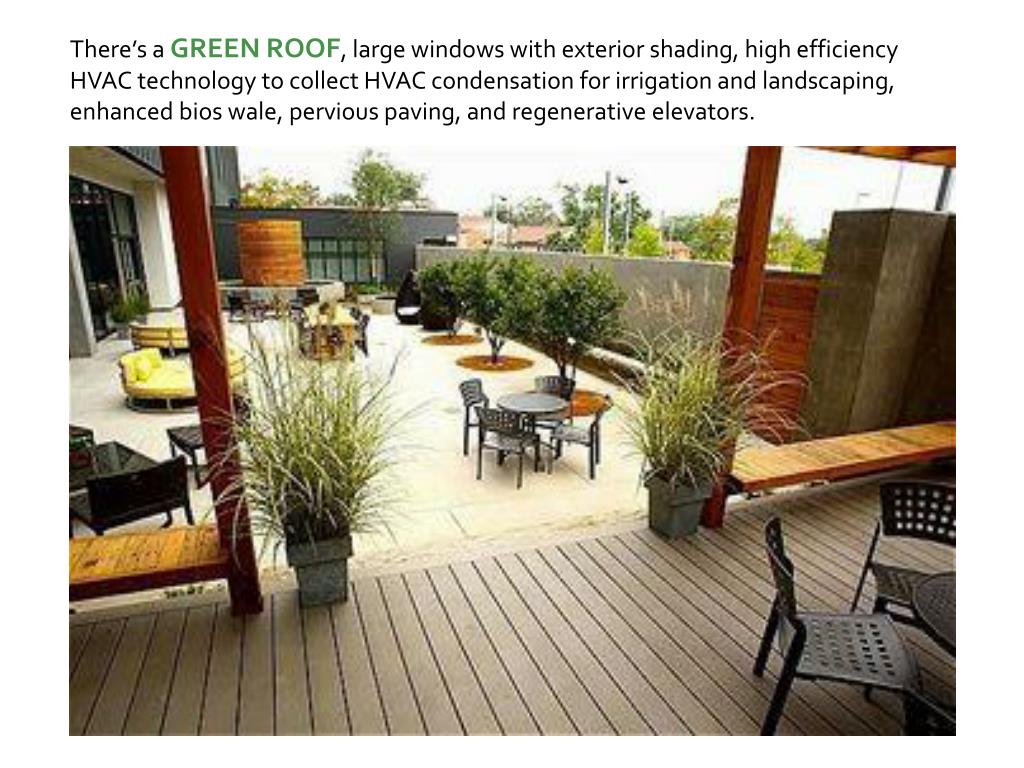 There’s a GREEN ROOF, large windows with exterior shading, high efficiency HVAC technology to collect HVAC condensation for irrigation and landscaping, enhanced bios wale, pervious paving, and regenerative elevators.