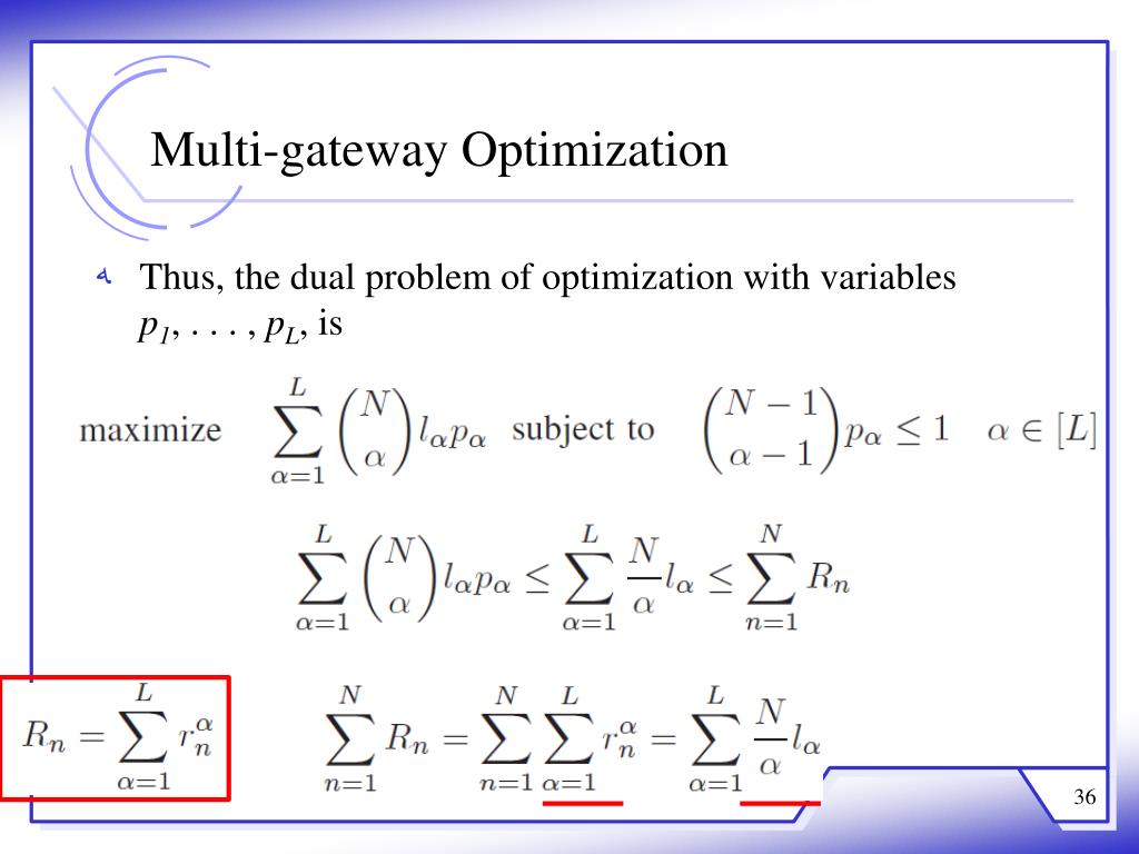 Multi-gateway Optimization • Thus, the dual problem of optimization with variables p1, . . . , pL, is