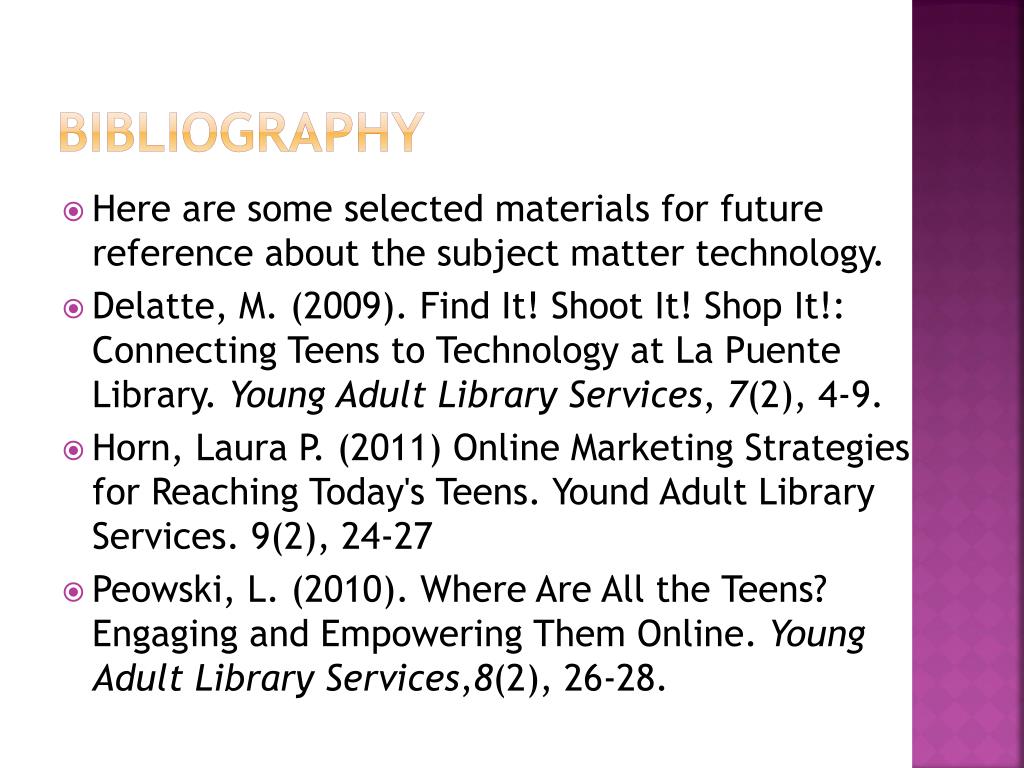Bibliography • Here are some selected materials for future reference about the subject matter technology. • Delatte, M. (2009). Find It! Shoot It! Shop It!: Connecting Teens to Technology at La Puente Library. Young Adult Library Services, 7(2), 4-9. • Horn, Laura P. (2011) Online Marketing Strategies for Reaching Today's Teens. Yound Adult Library Services. 9(2), 24-27 • Peowski, L. (2010). Where Are All the Teens? Engaging and Empowering Them Online. Young Adult Library Services,8(2), 26-28.