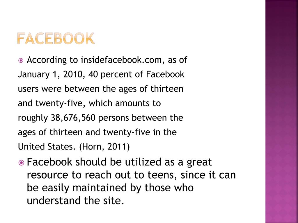 Facebook • According to insidefacebook.com, as of January 1, 2010, 40 percent of Facebook users were between the ages of thirteen and twenty-five, which amounts to roughly 38,676,560 persons between the ages of thirteen and twenty-five in the United States. (Horn, 2011) • Facebook should be utilized as a great resource to reach out to teens, since it can be easily maintained by those who understand the site.